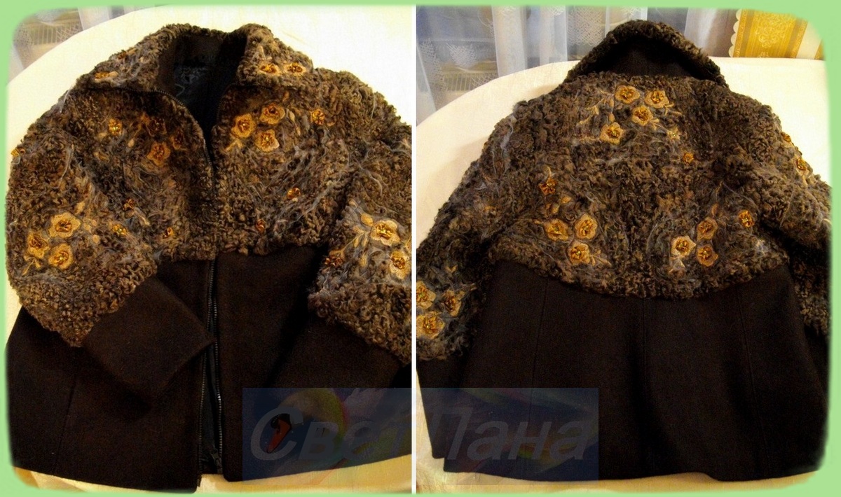 И получился у меня ,хоть и без особого блеска, но мягонький ворс на каракулевом основании шубы. Чем я и удовлетворилась, надеясь на то, что отделка в технике синели заглушит остальные внешние недостатки меха.